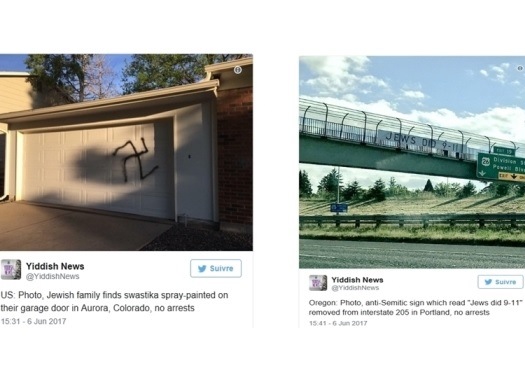 En juin, graffiti, messages antisémites et croix gammées ont été retrouvés en pleine rue à Pittsburgh,  puis chez des particuliers (les Wolf) dans l’Etat du Colorado ; en Oregon, un panneau placé sur l’autoroute accusait les Juifs d’être responsables de l’attentat du 11 septembre 2011 ; la porte d’une synagogue Habad à Colorado Springs a été couverte d’un autocollant anti-israélien ; le panneau d’entrée du camp d’été Weinstein de Richmond en Virginie a été recouvert d’une croix gammée ; trois synagogues de Los Angeles ont été visées par des alertes à la bombe ; le slogan « Free Gaza » a été tracé sur le trottoir devant l’épicerie juive Shmaltz Deli à Naperville, dans la banlieue de Chicago.
