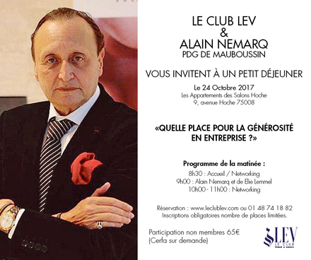 Pour sa première manifestation, le 24 octobre, le club Lev reçoit Alain Nemarq Président de Mauboussin, pour un petit déjeuner aux salons Hoche, a 8h30 sur le thème » Qu’elle place pour la générosité en entreprise ? »