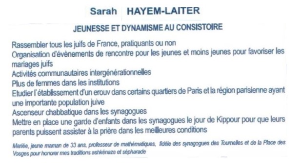 A titre personnel, je connais très bien Sarah Hayem-Laiter et sa famille. Elle saura porter les valeurs du judaïsme. Son programme orienté vers la jeunesse et les femmes permettra de rassembler un large public parmi nos coreligionnaires.