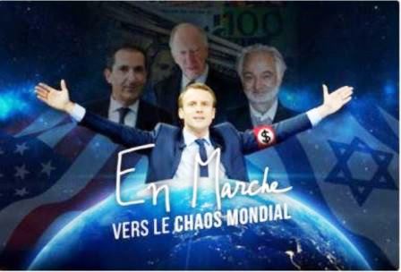 Le site internet Egalité et Réconciliation avait publié un photomontage représentant Emmanuel Macron, alors candidat à l’élection présidentielle, les bras ouverts, porteur d’un brassard évoquant ouvertement celui des nazis mais où la croix gammée est remplacée par le signe du dollar, avec devant lui le globe terrestre et derrière lui les photographies de Messieurs Patrick Drahi, Jacob Rothschild et Jacques Attali, et les drapeaux israélien et américain, la légende inscrite sur ce photomontage étant « En Marche vers le chaos mondial. »