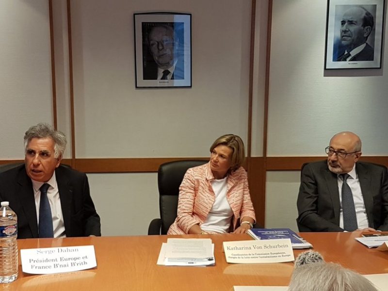 Avant la remise du prix des droits de l’homme du B’nai B’rith au mémorial de la Shoah, une réunion s’est tenue dans les locaux du Crif, en présence de Francis Kalifat, président du Crif, Serge Benhaim président du B’nai B’rith Europe et membre du bureau exécutif du Crif, Katharina Von Schnurbein, chargée au niveau européen de la lutte contre le racisme et l’antisémitisme, l’une des récipiendaires du prix, de quelques journalistes et des membres du B’nai B’rith .
