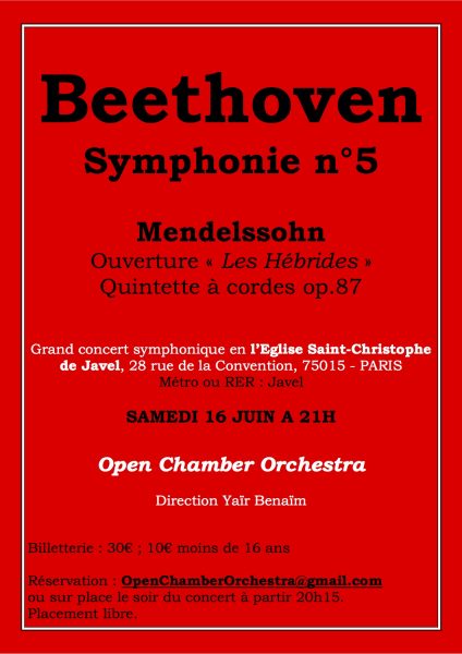 Après un magnifique premier concert en décembre dernier au Vésinet, c’est dans le 15ème arrondissement de Paris que se produira le 16 juin prochain, à 21 heures autour de la 5e symphonie de Beethoven, l’Open Chamber Orchestra dans l’église Saint-Christophe de Javel, 28 rue de la Convention, Paris 15ème, deuxième concert de l’Open Chamber Orchestra, orchestre symphonique parisien créé fin 2017 par Yaïr Benaïm.