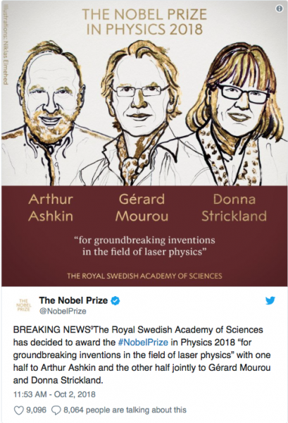 Arthur Ashkin, désormais le lauréat Nobel le plus âgé toutes catégories confondues, a mis au point la « pince optique » qui permet de manipuler des organismes extrêmement petits comme les cellules, les particules et les virus. Gérard Mourou, polytechnicien, et son étudiante Donna Strickland ont inventé la technique d’amplification des lasers, appelée « Chirped Pulse Amplification (CPA) », qui génère des impulsions ultracourtes et de très haute puissance.