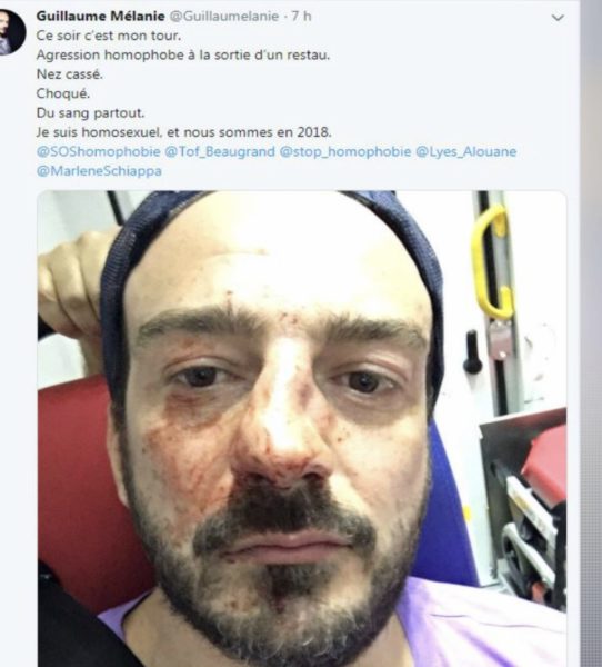 Ça se passe en France ce soir. Ce soir, c’est mon tour, tweete, encore choqué, Guillaume Mélanie, qui raconte avoir été victime d’une agression homophobe. Qui publie une photo montrant un visage tuméfié. En sang. Un nez cassé. Ce soir c’est mon tour. Agression homophobe à la sortie d’un restau. Nez cassé. Choqué. Du sang partout. Je suis homosexuel, et nous sommes en 2018.