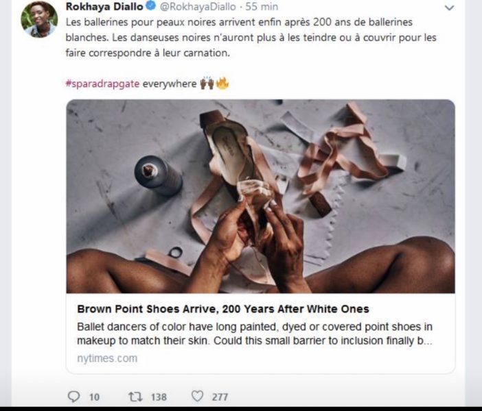 Voici un tweet de Rockaya Diallo qui se réjouit du fait qu’il existe des chaussures de danse noires pour les ballerines noires.