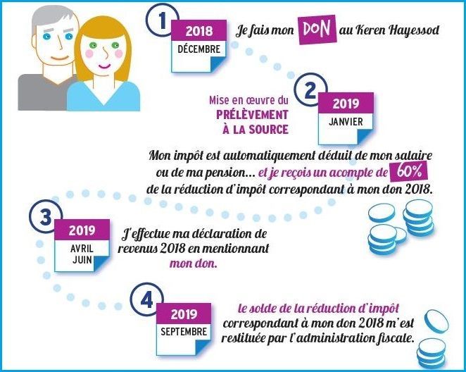 En 2019, avec le prélèvement à la source, vos dons faits au Keren Hayessod en 2018 ouvrent droit, comme d’habitude, à une réduction fiscale à savoir 66% de votre don, dans la limite de 20% de votre revenu imposable.