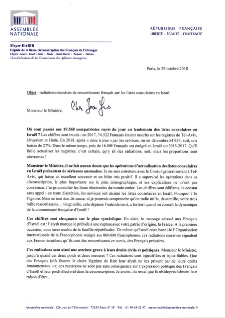 Dès le 29 octobre, le Député Meyer Habib avait écrit au Ministre des Affaires étrangères, avec copie au Président de la République, le courrier qui suit :