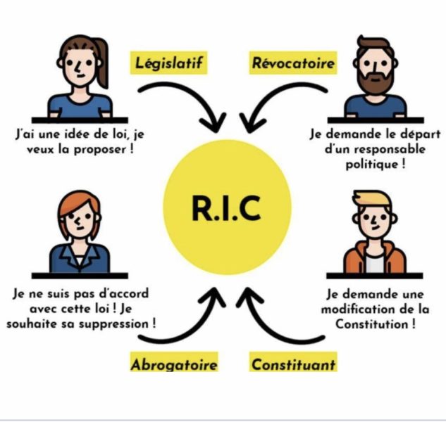 Le RIC ? Il a déjà été élargi au RICACLR. Entends Referendum d’Initiative Populaire Abrogatoire, Constituant, Législatif et Révocatoire : l’idée étant d’étendre au maximum le pouvoir d’intervention citoyen, offrant l’opportunité de réclamer une nouvelle loi ou d’exiger la suppression d’un texte, de modifier la constitution ainsi que de contraindre un élue au départ.