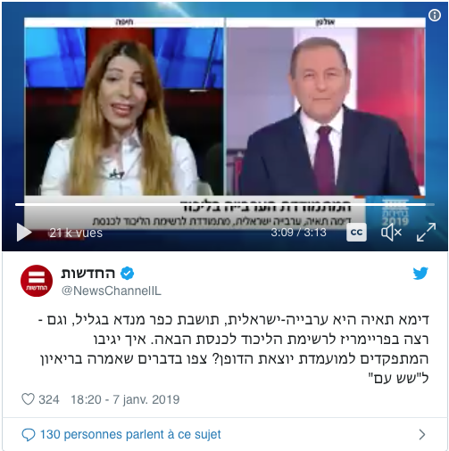 L’animateur de l’émission, Boaz Golan, lui alors révélé qu’un ministre du Likoud avait déjà fait savoir qu’il faudrait l’aider à entrer à la Knesset. Il a également relevé le nombre impressionnant de réactions positives de soutien et d’admiration dans les réseaux sociaux, soulignant que cette candidature ne pourra que rapprocher les deux populations. L’un des internautes est allé jusqu’à proposer que Dima Tayah soit un jour nommée ministre de la ‘Hasbara’!