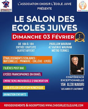 Dimanche 03 février 2019, venez rencontrer les directeurs et équipes pédagogiques de l’ensemble des institutions scolaires juives et anticiper la prochaine rentrée scolaire.