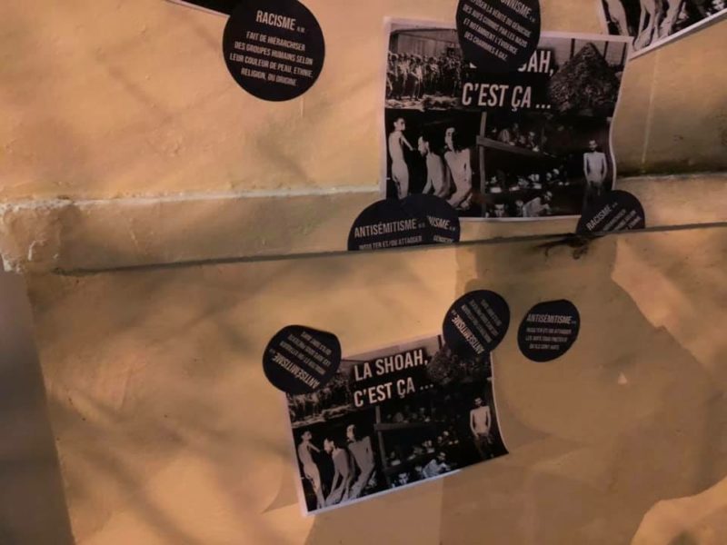 Le spectacle débute, nous enchaînons avec une playlist de Hard Metal pour empêcher le gourou antisémite de maintenir son spectacle. Pendant ce temps des militants refont la décoration eu théâtre de l’Ampoule en collant ces images des camps de la mort, avec des autocollants définissant le racisme, l’antisémitisme et le négationnisme pour les fans qui l’auraient oublié.