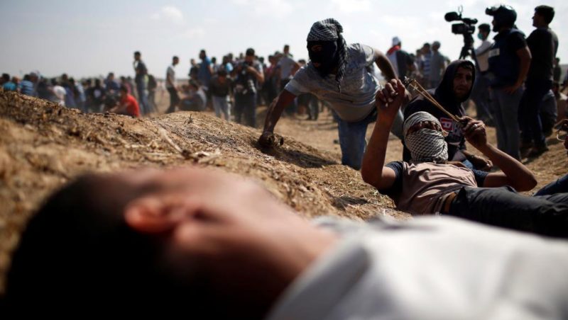 Des manifestants palestiniens se couvrent pendant une nouvelle journée de la «Grande marche du retour», à la frontière entre Israël et la bande de Gaza, le 11 mai 2018. -REUTERS/Mohammed Salem
