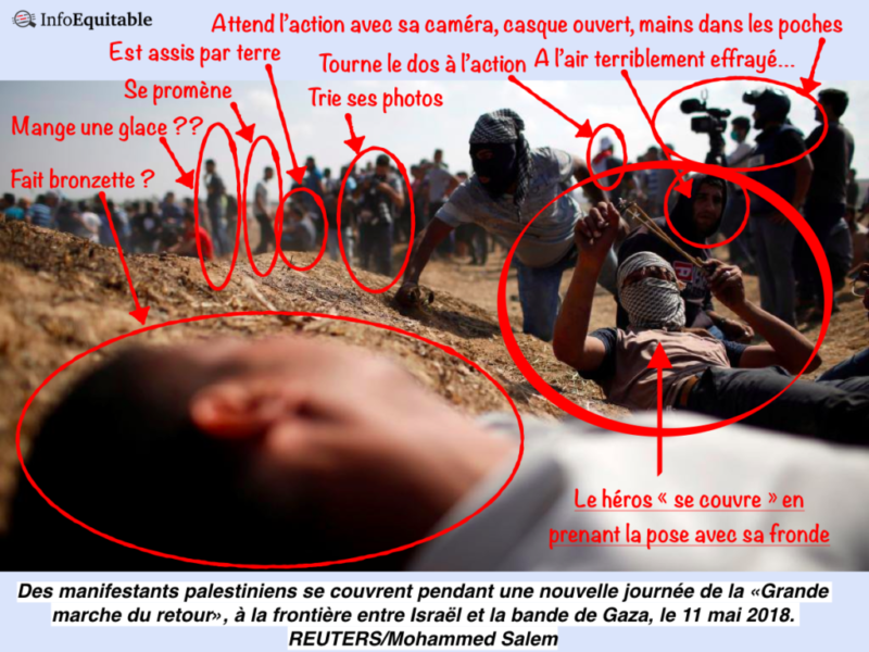 Le lecteur est bien sûr invité à comprendre que si les « manifestants » doivent se « couvrir », c’est supposément pour se protéger d’Israël, accusé d’avoir fait « près de 250 morts et plus de 6000 blessés dans les rangs des manifestants » (des chiffres non sourcés mais provenant évidemment des autorités de Gaza sous contrôle du Hamas, sans préciser que plus de 80%des victimes sont des membres d’organisations armées).