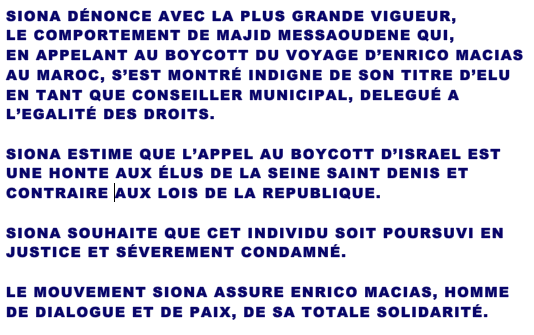 Enrico Macias au Maroc : Majid Messaoudene n’est pas d’accord Tribune Juive il y a 7 ans COMMUNIQUE DE SIONA Roger PINTO Président sionafrance.fr
