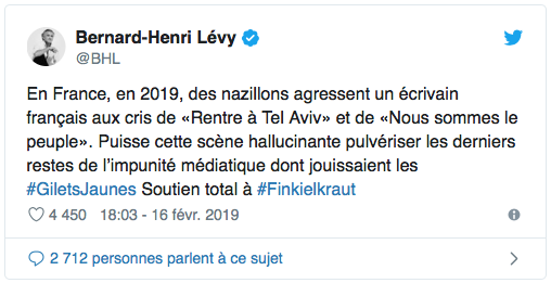 « Cette violence contre les journalistes, contre les policiers, contre la représentation nationale, a commencé dès les premiers actes de ce mouvement », rappelle Bernard-Henri Lévy. « La violence contre les juifs, les slogans antisémites sont comme le terme de ce mouvement, l’aboutissement de cette distillation. On commence par le référendum d’initiative citoyenne et on finit par l’antisémitisme. On commence avec Rousseau et on finit avec Doriot. Ce ne sont pas les marges ça, c’est le cœur du mouvement ! », martèle-t-il.