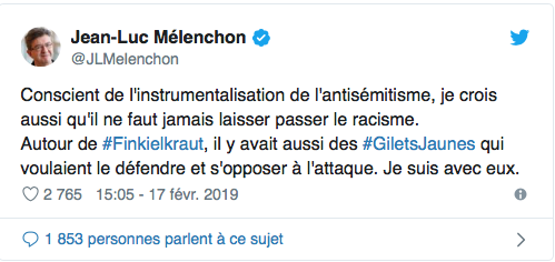 Les propos « ahurissants » de Jean-Luc Mélenchon. Le philosophe s’insurge également contre les voix qui ont minimisé l’agression dont a été victime Alain Finkielkraut, et notamment contre Jean-Luc Mélenchon, le leader de La France insoumise. Dans un tweet, le député des Bouches-du-Rhône a estimé qu’il ne fallait « jamais lasser passer le racisme », mais se dit également « conscient de l’instrumentalisation de l’antisémitisme ». « Quand je vois certains leader politiques comme Jean-Luc Mélenchon dire des choses absolument ahurissantes : antisémitisme instrumentalisé, comme s’il fallait l’opposer à un antisémitisme franc et loyal », s’agace Bernard-Henri Lévy.