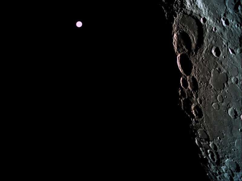 Une photo du relief de la lune en gros plan à droite et un point lumineux au loin, la Terre !