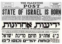 David Ben Gourion, exceptionnellement vêtu d’un costume et d’une cravate, donne lecture devant le conseil national sioniste, qui se tient au musée de Tel Aviv, de la proclamation d’indépendance : « Un Etat juif est instauré en Palestine. Il s’appellera Israël ».