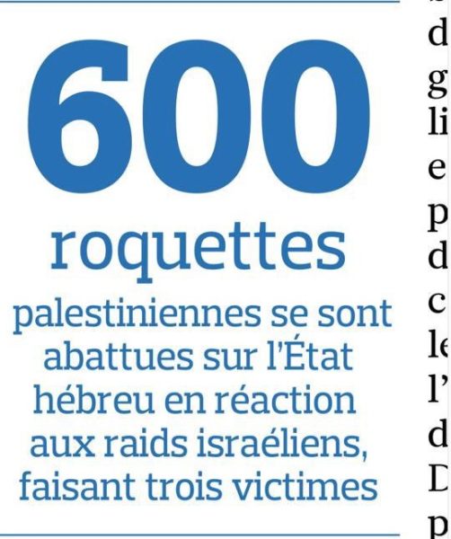 « 600 roquettes palestiniennes se sont abattues sur l’Etat hébreu en réaction aux raids israéliens faisant 3 victimes »