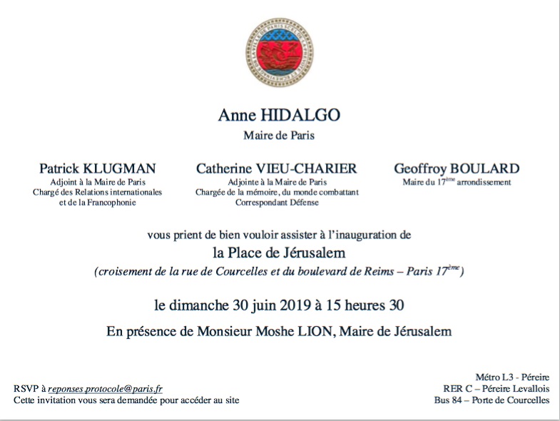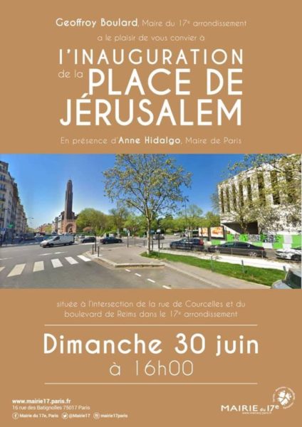 Dimanche 30 juin à 16 heures, Monsieur Geoffroy Boulard, maire du 17ème arrondissement de Paris inaugurera la Place de Jérusalem en présence de Madame Anne Hidalgo, Maire de Paris.