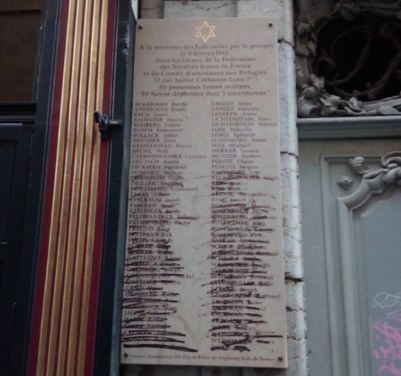 Le même jour, une plaque commémorative « A la mémoire des [86] Juifs raflés par la Gestapo le 9 février 1943 » est découverte vandalisée à Lyon. Les noms sont partiellement barrés au marqueur noir. Quelques réactions, dont celle de Gérard Collomb.