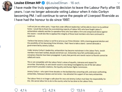 Le 16 octobre, la députée britannique Louise Ellman démissionne du Labour, gangréné par l’antisémitisme. Elle explique : « Sous la direction de Jérémy Corbyn, l’antisémitisme s’est banalisé au sein du Parti travailliste. Les adhérents juifs y ont été intimidés, injuriés et poussés à partir. Les antisémites s’y sentent à l’aise et d’infectes théories du complot ont été propagées. » C’est la troisième figure politique juive à quitter le Labour depuis décembre 2018.