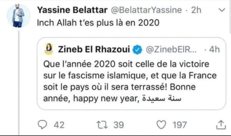 Parce que Zineb El Rhazoui s’oppose à cette idéologie qui est très officiellement notre ennemie, Belattar lui répond en souhaitant sa mort, au nom d’Allah. Il n’y a pas de 2ème ou de 4ème degré, il y a une continuité de haine chez un individu qui a commencé depuis bien longtemps à fréquenter les officines islamistes du CCIF et à promouvoir de manière 《 soft》 – enfin si l’on peut dire !- la petite musique victimaire de gens qui pleurent en souriant, qui prient la mort des autres en appelant à l’aide et qui affichent fièrement leur intolérance, en vous traitant de raciste.