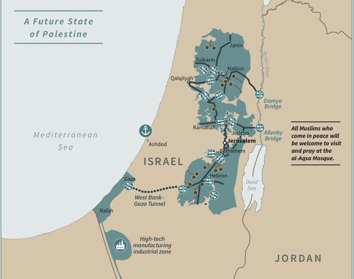 Il permet à Israël d’annexer entre 30 et 40 % des terres de la zone C, et les Palestiniens auraient le contrôle d’environ 40 % des zones A et B. De plus, Israël n’aura pas accès aux zones désignées pour l’État palestinien. Cette condition vise à encourager la partie palestinienne à se rendre à la table des négociations.
