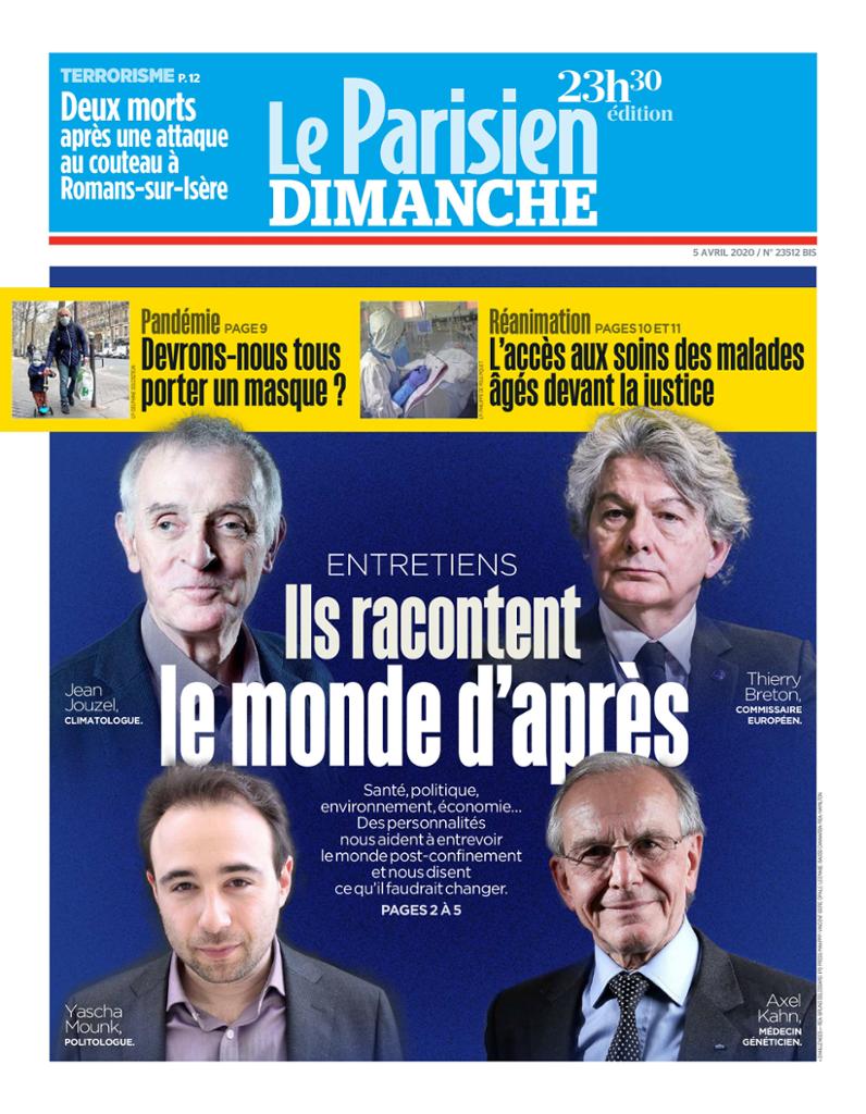 C’est une Une qui n’est pas passée inaperçue. Le Parisien, dans son édition du 5 avril, tente de se projeter vers “le monde d’après” crise du Covid-19 et met en avant quatre personnalités censées “raconter le monde d’après”. L’ancien ministre et actuel commissaire européen Thierry Breton, l’essayiste Yascha Mounk, le généticien Axel Kahn et le climatologue Jean Jouzel.
