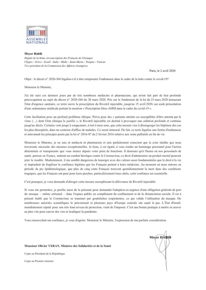 « CORONAVIRUS : L’ETAT D’URGENCE NE PEUT JUSTIFIER L’EUTHANASIE ! – MA LETTRE AU MINISTRE DE LA SANTE – INTERVIEW CE SOIR À 19.30 SUR I24 NEWS AVEC VALERIE PEREZ et 18H SUR RADIO SHALOMInterpellé ce matin par le témoignage du Docteur Hardy dans l’émission de Bernard Abouaf sur Radio Shalom, qui faisait part de son émotion suite au décret du 28 mars 2020 légalisant de fait l’euthanasie, j’ai immédiatement décidé d’écrire au Ministre de la Santé Olivier Véran, avec copie au Premier ministre et au Président de la République. Pris dans le cadre de l’état d’urgence sanitaire, ce texte facilite jusqu’au 15 avril la prescription de Rivotril injectable, un puissant sédatif qui provoque le décès. Certains vont jusqu’à soupçonner, à tort à mon sens, que cette mesure vise à désengorger les hôpitaux des cas les plus désespérés, dans un contexte d’afflux de malades ».