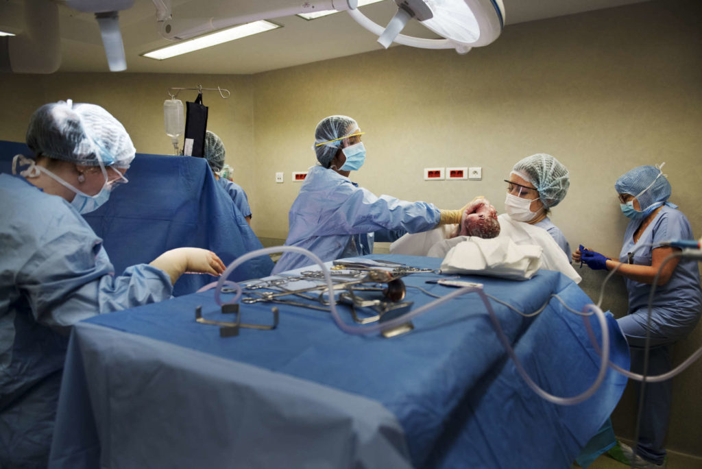 Mya va mieux, elle peut être enfin présentée à sa mère, encore engourdie par l’anesthésie. L’équipe de nuit, à droite, s’occupe de la transmission.