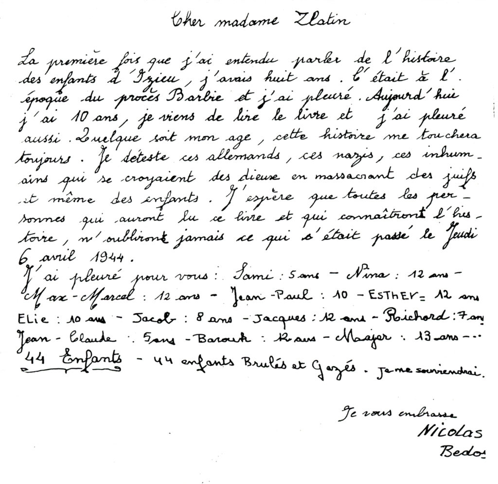 « Une partie de la réussite populaire de notre souscription [ndlr : allusion à la souscription nationale lancée en 1990 par l’association des amis du musée-mémorial d’Izieu pour acheter la Maison] est grandement redevable à Guy Bedos. Pendant le procès de K. Barbie, j’avais lu que le fils de Bedos, Nicolas, qui avait alors 8 ou 9 ans, lui avait demandé : « Qui c’est Barbie ? Est-ce la poupée Barbie ? » Guy Bedos avait raconté à son fils l’histoire d’Izieu. Nicolas lui avait dit : « C’est trop fort. J’aimerais bien connaître Madame Zlatin ». Il m’avait alors écrit une petite lettre à laquelle j’avais répondu. Bedos m’avait téléphoné en me disant que s’il pouvait faire quelque chose pour moi, je pourrais compter sur lui.