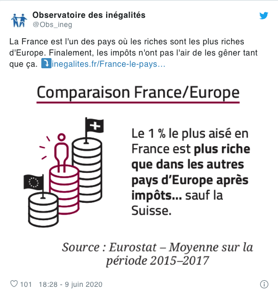 Oui, les riches sont très riches en France, même après avoir payé leurs impôts. Ils le sont même plus qu’ailleurs en Europe : hormis la Suisse, la France est le pays où le 1% le plus aisé a le niveau de vie le plus élevé », ont-ils même relevé.