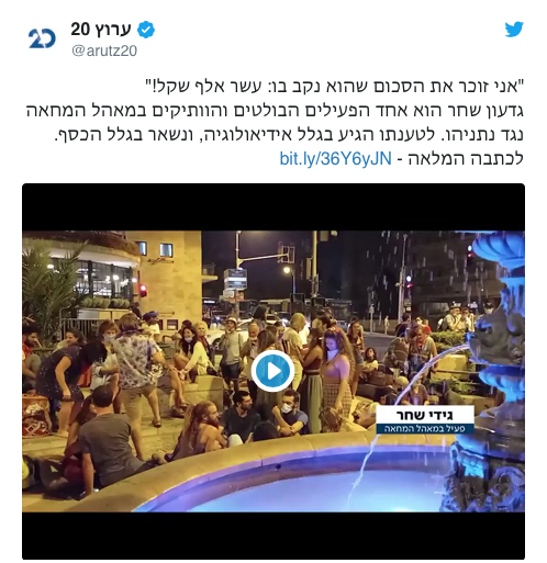 Gideon Sha’har, l’une des icônes des manifestations anti-Netanyahou se bat aujourd’hui la coulpe. Celui qui est allé jusqu’à qualifier les policiers de « nazis » se retourne aujourd’hui contre les organisateurs des manifestations : « J’ai commis une erreur, j’étais aveugle, les activistes de ces manifestations sont des corrompus et des voleurs. Ils prennent l’argent pour eux et mentent à la population »!