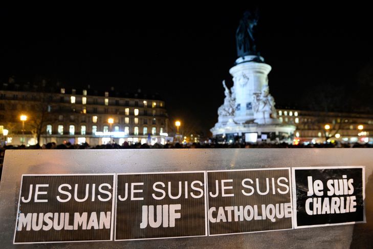« Je suis musulman, je suis juif, je suis catholique, je suis Charlie », disent des pancartes installée de la République à Paris, le 8 janvier 2015, au lendemain de l’attaque contre Charlie Hebdo. BERTRAND GUAY/AFP
