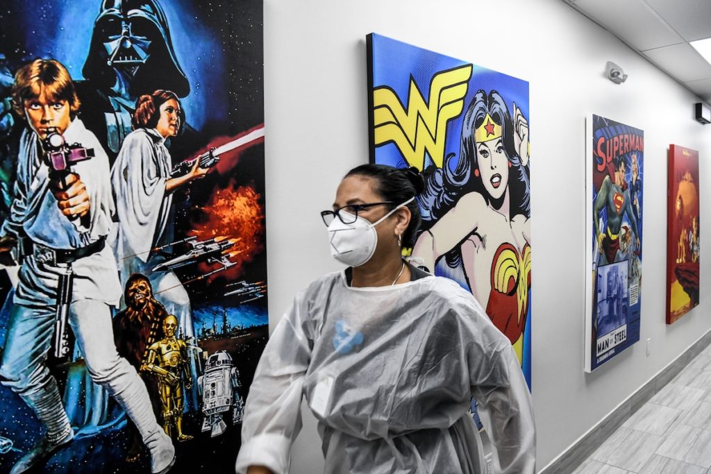 « Pourquoi la cape? », lui ai-je demandé. « Parce qu’ici nous sommes tous des héros, ma chérie », m’a-t-elle dit. On m’a offert plusieurs autocollants, un t-shirt et un masque, tous portant le message « Covid Warriors » (Guerriers du Covid) et un dessin montrant un super-héros combattant le virus. J’ai ensuite du télécharger une application conçue pour l’étude, où je dois à l’occasion renseigner ma température et mes symptômes.