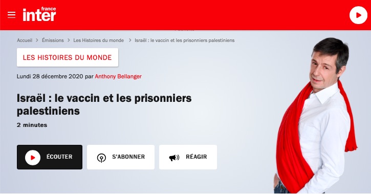 Le lundi 28 décembre, le journaliste Anthony Bellanger affirme dans sa chronique « Les histoires du monde » que les « prisonniers palestiniens » seraient privés de vaccin contre le Covid-19.