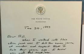 Parmi toutes ces lettres de président à président, celle laissée, le 20 janvier 1993, par le républicain George H.W. Bush à son successeur démocrate Bill Clinton, a marqué les esprits, par sa dignité, sa classe.