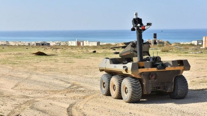 C’est la première exposition de ce robot « Jaguar » qui a désormais combattre les terroristes qui opèrent aux frontières de Gaza: Le robot «Jaguar», fabriqué par IAI [Industrie Aéronautique Israélienne], est en cours d’intégration ces semaines-ci. Il devrait être l’un des premiers à permettre l’identification et la destruction de terroristes et il sera contrôlé à distance.