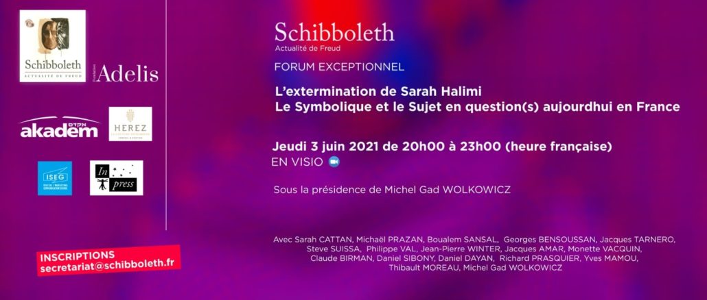 Chères amies et chers amis, Nous avons le plaisir et l’honneurde vous inviter auSéminaire 2020-2021 Schibboleth – Actualité de Freud Le monde d’avant… ? et le monde d’après… … Lire la suite de Schibboleth – Actualité de Freud. L’extermination de Sarah Halimi Le Symbolique et le Sujet en question(s) aujourd’hui en France. 3 juin