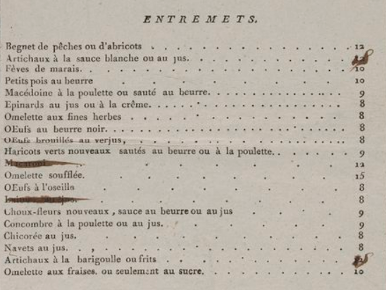 La grande nouveauté des restaurants d’alors est le menu. Les restaurants proposent très souvent un choix incalculable de plats. Le menu a donc été inventé car « il ne propose qu’un « menu » aperçu de la prodigalité de l’établissement » comme l’écrit l’historienne Rebecca Spang.