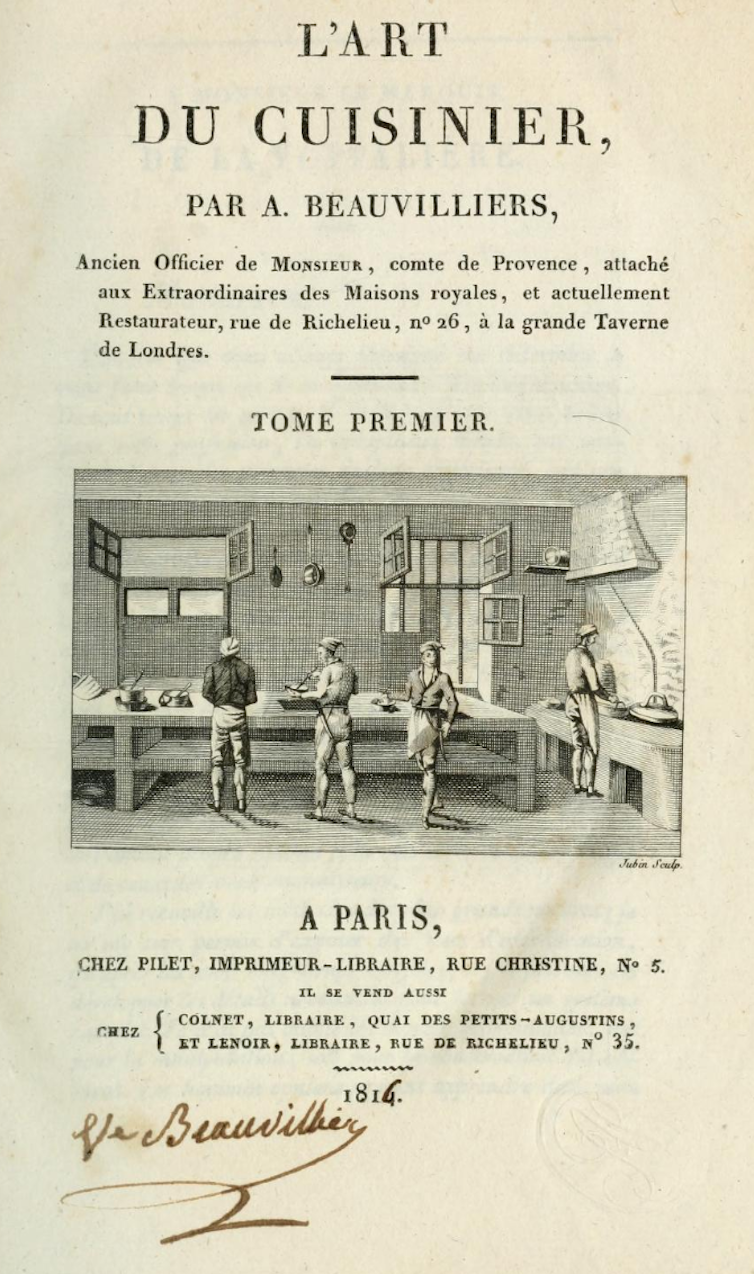 Dans les années précédant puis suivant la Révolution française, de nombreux cuisiniers, qui jusqu’alors travaillaient pour des membres de la noblesse, suivront l’exemple d’Antoine de Beauvilliers et ouvriront leur propre restaurant. C’est ainsi qu’une cuisine de qualité faite de recettes, de rites et de façons de manger, mais comprenant aussi les arts de la table passa des cuisines privées de l’aristocratie à celles, publiques, de la haute société.