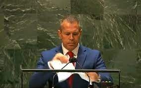 Rappelant le jour où Chaim Herzog avait déchiré sur ce même podium, en novembre 1975, au sein de la même Instance, la Résolution déclarant que le droit du peuple juif d’avoir un foyer national était … raciste, Gilad Erdan a conclu : C’est exactement ce qu’il faut faire à ce rapport antisémite déformé à sens unique, et, ajoutant que sa seule place était « dans la poubelle de l’antisémitisme », il le montra, et le déchira, avant de quitter l’estrade.