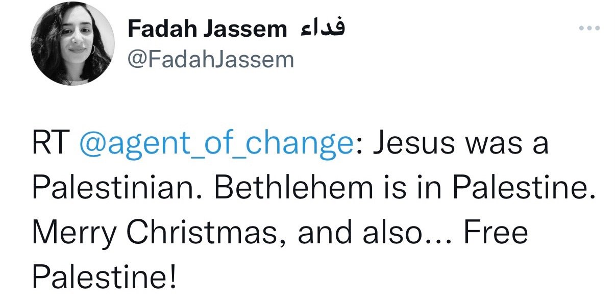 Jassem a également retweeté un message déclarant qu’Israël n’était « pas né » mais plutôt « lâché comme une bombe au milieu de la Palestine » et a amplifié le faux récit selon lequel « Jésus était un Palestinien ».