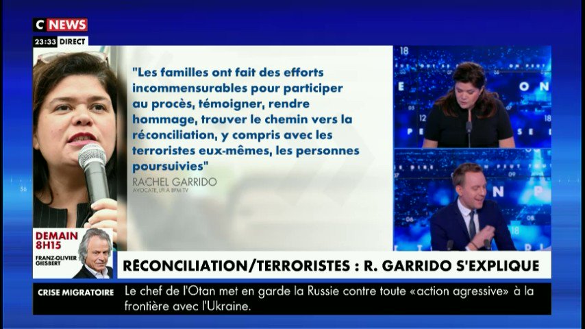 Eric Zemmour a aussi lui-même répondu en affirmant, face à l’avocate qui «veut la réconciliation avec les terroristes», que lui «veut la victoire sur le djihadisme». «Nous ne sommes pas du même côté de la ligne de front», a-t-il asséné sur Twitter. Son ancien comparse des plateaux de télévision Éric Naulleau a commenté quant à lui sobrement «Abjection votre honneur !».