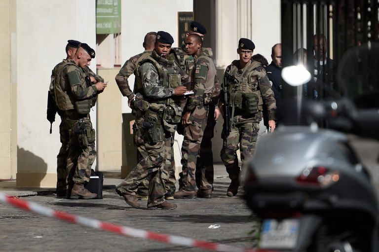 French soldiers gather at the site where a car slammed into soldiers on patrol in Levallois-Perret, outside Paris, on August 9, 2017. A car slammed into soldiers on patrol outside Paris on on August 9, injuring six people, two of them seriously, police said. The vehicle took off after the incident, which took place at about 8:00 am (0600 GMT) in the northwestern suburb of Levallois-Perret. / AFP PHOTO / STEPHANE DE SAKUTIN