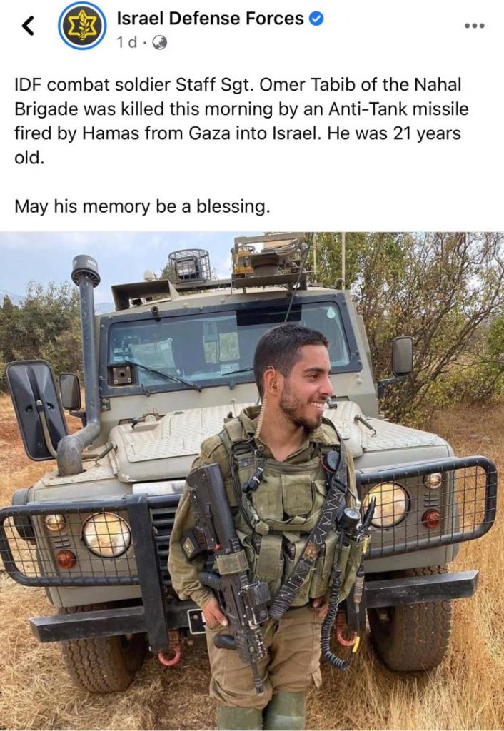 Photo de Une : Le combattant de Tsahal, le sergent-chef Omer Tabib de la Brigade Nahal, a été tué le 14 mai 2021 (date commémorative de l’Indépendance d’Israël) par un missile antichar tiré par le Hamas depuis Gaza vers Israël. Il avait 21 ans. (Crédit : armée israélienne)