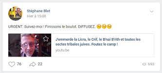 Stéphane BLET proche des milieux les plus antisémites tels que « Démocratie participative » vivait une obsession antijuive, qui l’avait mené devant les tribunaux correctionnels à de nombreuses reprises.