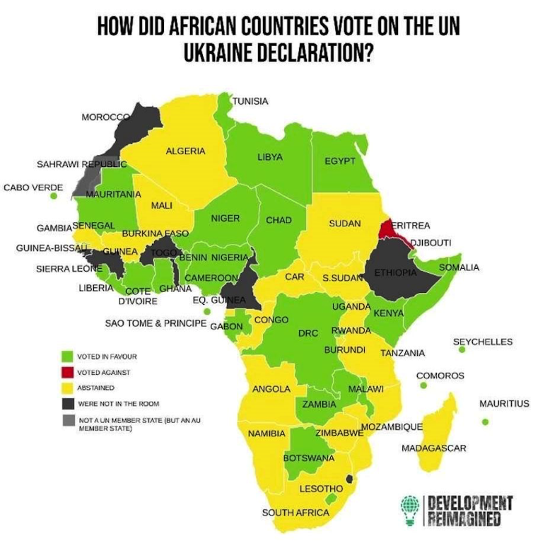 Le vote de certains pays africains est une réminiscence des vieilles loyautés de l’époque de la guerre froide et de la décolonisation. Le souvenir du soutien soviétique à la décolonisation, l’alignement pro-soviétique de certains pays africains (Angola, Algérie, Ethiopie, etc.) et l’avènement au pouvoir d’anciens mouvements de libération soutenus par l’URSS (Mozambique, Namibie, Afrique du Sud, Zimbabwe) font partie de l’héritage historique des relations russo-africaines.