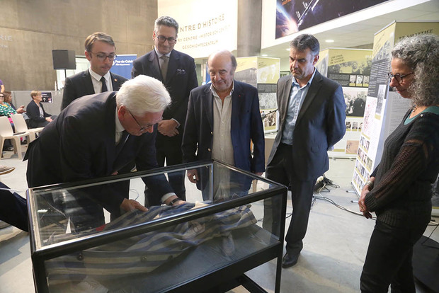 Alain et Florence Alpern ont remis à la Coupole le manteau de déporté de leur père, Nathan. Il a été déposé délicatement dans la vitrine par Jean-Claude Leroy, président du conseil départemental.